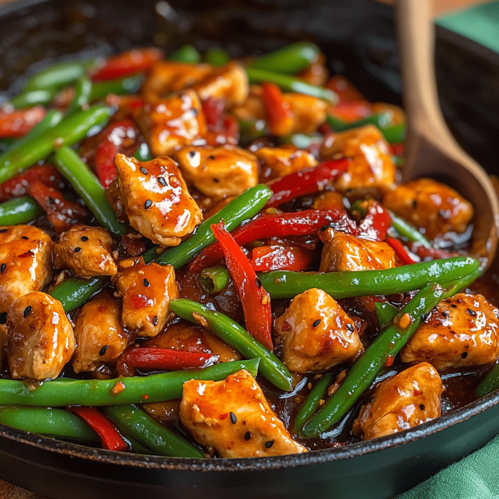 Use chicken thighs for juiciness. Substitute with tofu or shrimp if desired. Pat green beans dry for best texture.