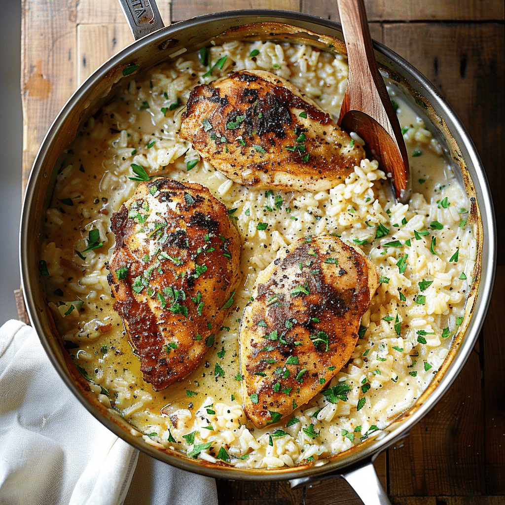 A one-pan dish featuring juicy chicken fillets and creamy rice enriched with mascarpone and Parmesan. Comforting, quick, and full of flavor.