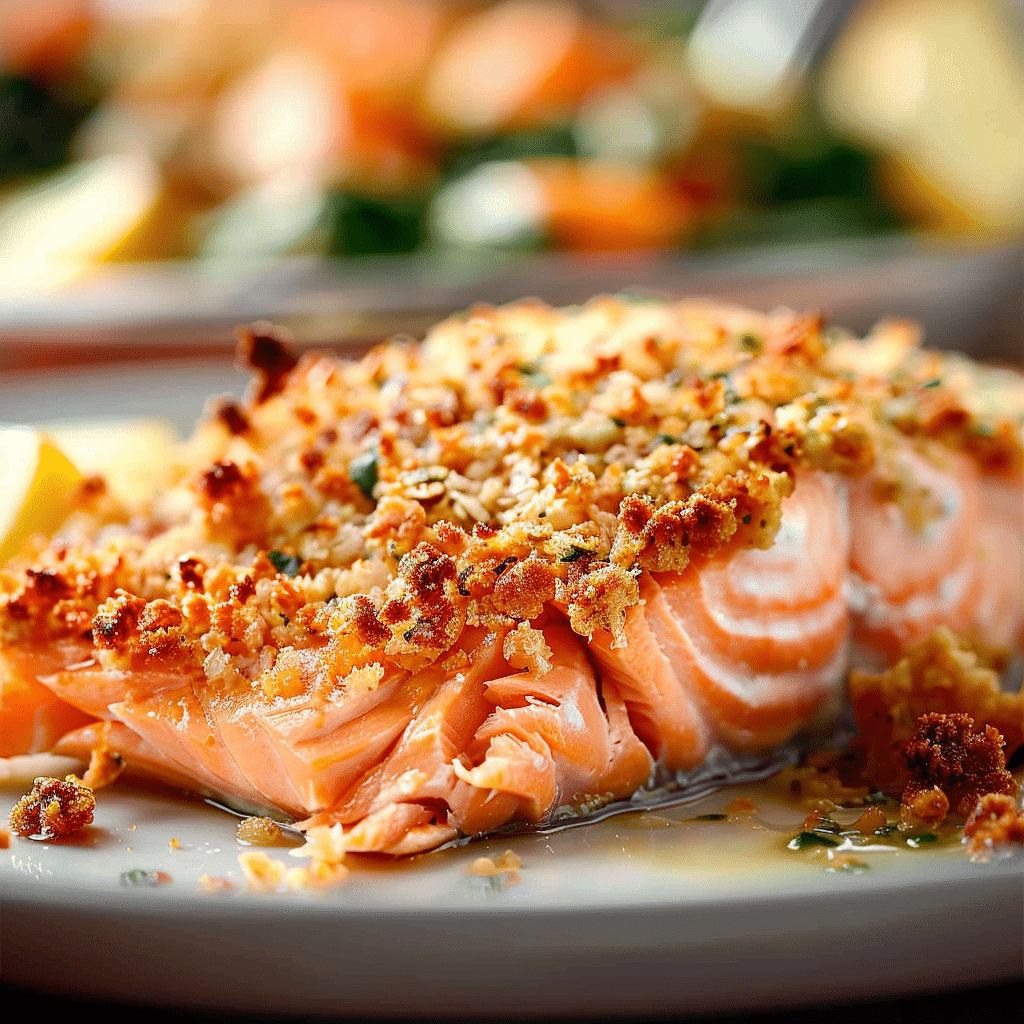 This dish brings together the bold, savory taste of garlic, herbs, and parmesan with the light texture of Panko crumbs for an ultra-crispy finish. The salmon stays juicy underneath while the topping bakes to a perfect golden brown.