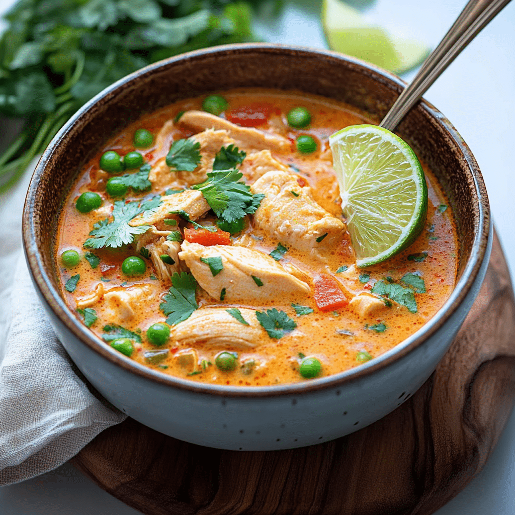 A fragrant, creamy, and comforting Thai-inspired chicken soup made in the crock pot. Featuring bold ginger, coconut milk, and tender chicken, this slow-cooked dish is perfect for busy nights.