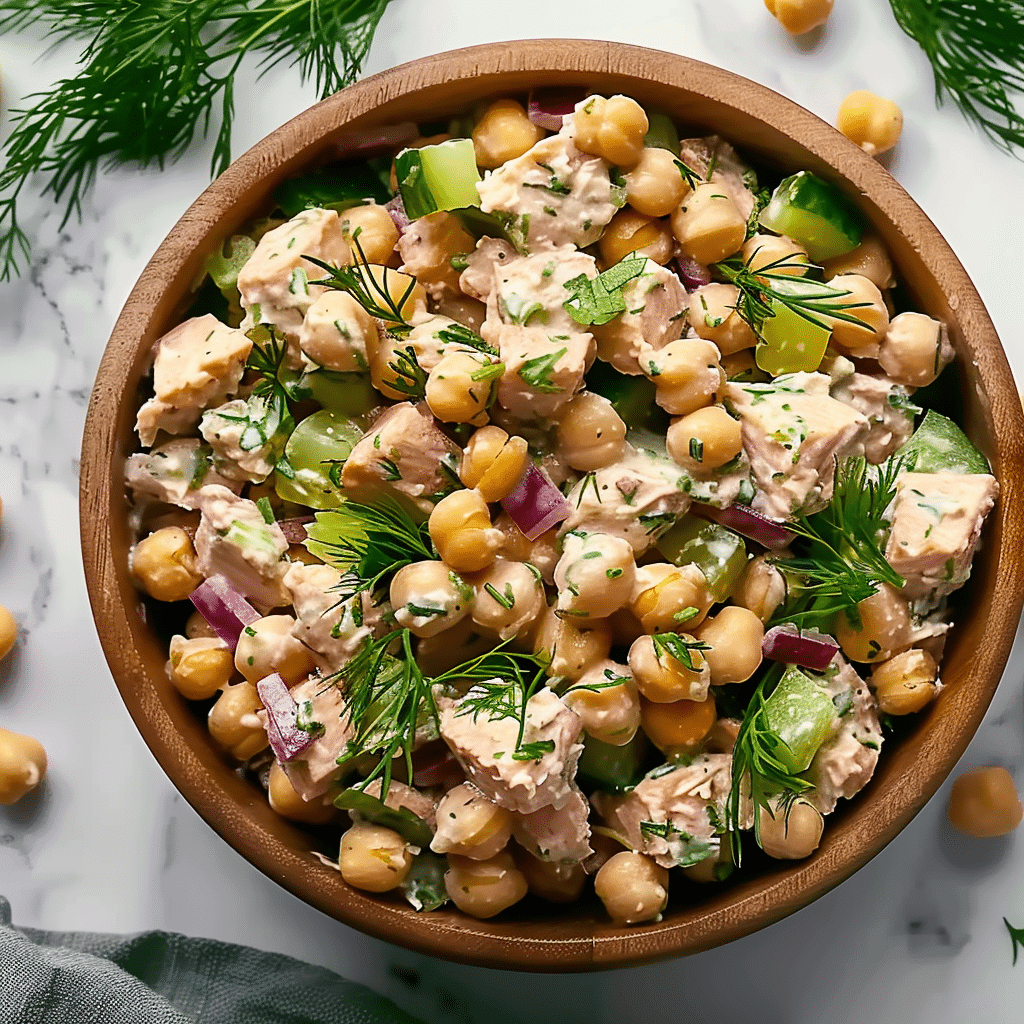 A fresh, protein-rich tuna and chickpea salad with lemon-Dijon dressing. Quick to prepare and perfect for lunch, wraps, or healthy snacks.
