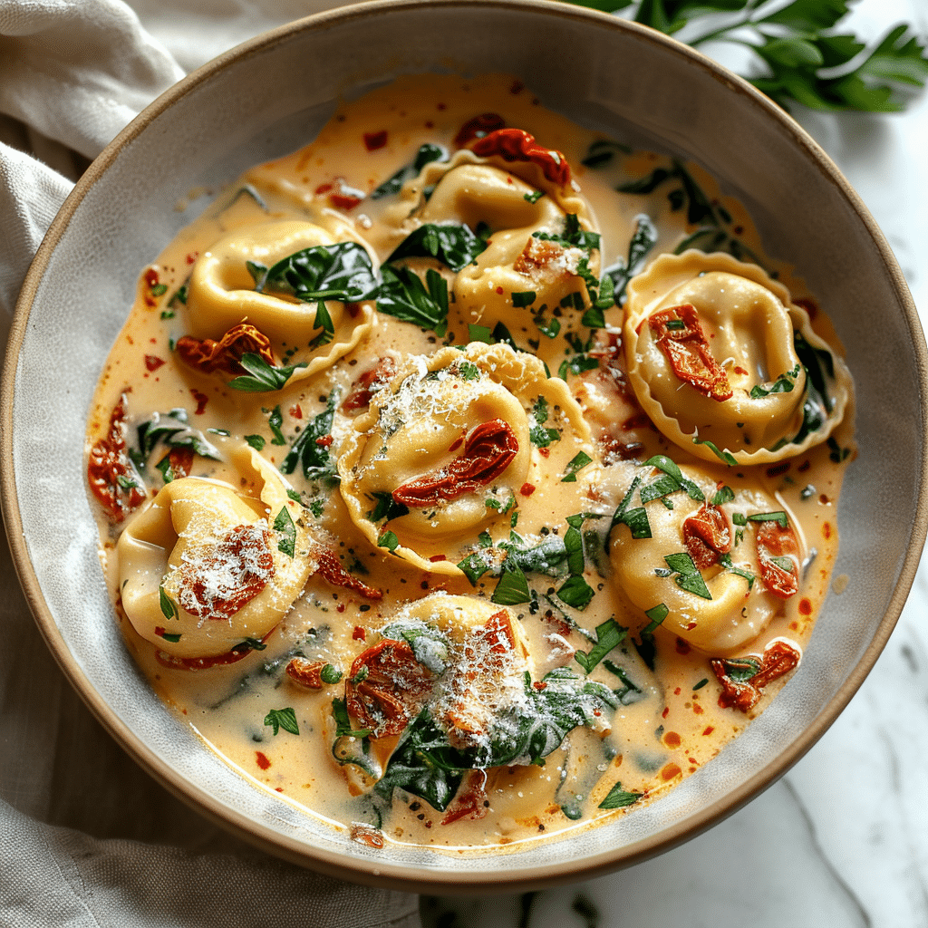 You’ll begin by boiling your tortellini until they’re just tender. While that’s happening, sauté garlic in a bit of olive oil until it smells amazing. Cream goes in next and simmers gently to thicken. Then come the chopped sun-dried tomatoes and herbs, which infuse the sauce with flavor. Fresh spinach is added and quickly wilts, and finally, the cooked tortellini are folded in. A generous handful of grated Parmesan ties it all together. Serve with fresh parsley and a sprinkle of extra cheese for a beautiful finish.