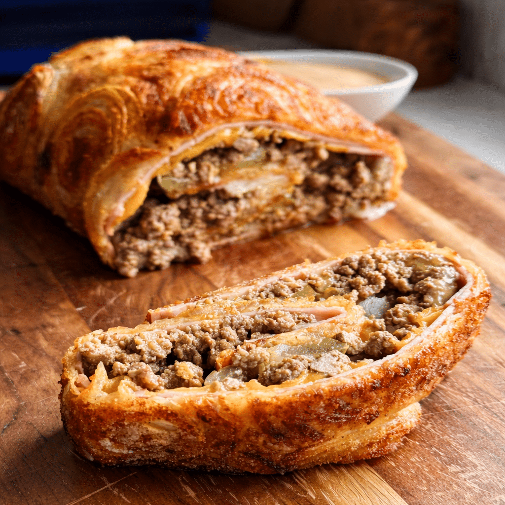 A viral take on cheeseburgers, this onion ring roll swaps out the bun for a crispy parmesan-onion base, stuffed with seasoned meat, cheese, ham, and pickles. Oven-baked and easy to slice, it’s low-carb and full of flavor.